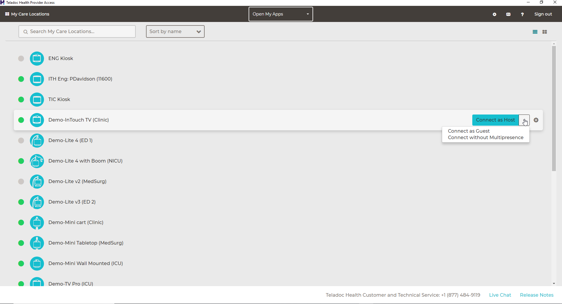 , in the My Care Locations list. - When connecting as a Host in MultiPresence, you must connect using the Host option in the connection drop-down instead of clicking Connect next to the Patient Access Device name, which will connect to the device without MultiPresence. If this occurs, disconnect from the device and reconnect to the device by selecting Host from the Connect drop-down menu.