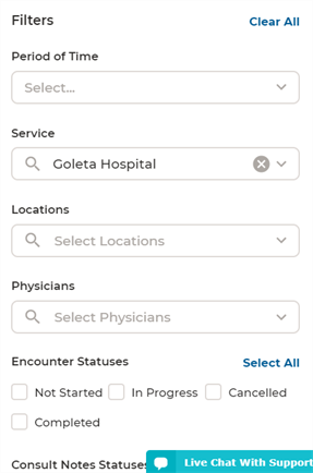 - Search: Enter a patient's name, or ID, to search for a patient. When a patient's name is selected, the middle panel will populate with a list of patient names that match your entry. An Advanced search option allows a list of ALL patientsl. The Filter feature on the right panel allows you to narrow your search.